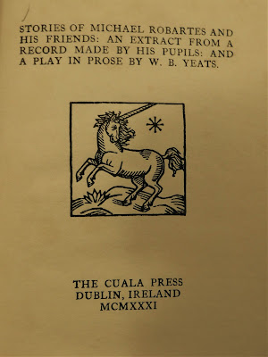 The dedication above indicates that the Cadburys, William and Emmeline, had some connection with Elizabeth Yeats, even if it was just through the support of her press. Elizabeth was the brother of WB Yeats. With her sister Lily and someone called Evelyn Gleeson she had established Dun Emer Industries in the town of Dundrum on the edge of Dublin (it's now a suburb of the city) in 1902. This was intended as a William Morris style arts and crafts enterprise, with Lily and Loly (as Elizabeth was known to her friends) being in charge of the printing side of things whilst Evelyn looked after the weaving and embroidery. It was named after Lady Emer, the wife of the legendary hero Cuchulainn who was renowned for her needlework skills. The illustration on the title page of early Cuala Press and Dun Emer books, drawn by Elinor Mary Monsell, depicts Lady Emer leaning with willowy art nouveau languor against a tree. Things didn't work out as planned, however, and the two halves of the enterprise soon went their separate ways. The Yeats sisters branched off as Dun Emer Industries in 1904 and pursued their literary endeavours with the Dun Emer press. Elizabeth had been a part of William Morris' circle in the latter part of the 19th century and had been encouraged to learn the art of printing and typography by Emery Walker, who had worked for Morris' Kelmscott Press. Incidentally, we have a number of very fine Kelmscott Press books down in the cage. It's a subject we shall return to in a future post. Elizabeth even used the same kind of printer that the Kelmscott Press had employed - an Albion press, a heavy piece of hand-operated machinery which she learned to operate herself.