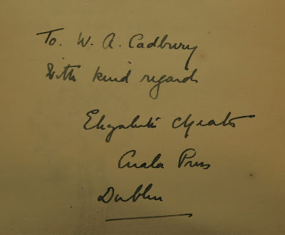 There are a few other significant signatures in amongst William Cadbury's old collection. One is from Lady Augusta Gregory, at the end of her collection of lyrical translations of the old Irish verse. Lady Gregory was another important figure in the Celtic Revival. Her house and its estate at Coole in Galway was an important meeting place for the literary figures of that movement, WB Yeats included. One of his best known poems, The Wild Swans at Coole, was inspired by the surroundings. It was also at Coole that he met Evelyn Gleeson, the Yeats sisters' initial collaborator in the Dun Emer enterprise. Lady Gregory had also joined WB Yeats and Edward Martyn and others in forming the influential Irish Literary Theatre and later the Abbey Theatre (or the National Theatre of Ireland), where plays by the likes of Yeats, JM Synge and Sean O'Casey, as well as Gregory herself, were first performed. Her message to William Cadbury, written on March (?) 23rd 1918, has a touch of aristocratic hauteur about it: 'I write my name here for W.Cadbury, and hope he will not be disappointed in the book'.