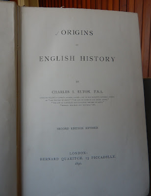 Whilst bookselling and purchasing was always the primary focus of Quaritch's business, his publishing seemed to become a major sideline, particularly in the 1890s. We have a number of books in the stack bearing the publisher's address: London: Bernard Quaritch, 15 Picadilly. They cover a surprisingly wide range of subjects. There's a lovely 6 volume set of William Morris' translations of the Icelandic sagas with gilded spines, gathered together under the title The Saga Library. A very handsome volume of Lady Charlotte Guest's translation of The Mabinogion was published in 1877, its red cover presumably denoting its provenance in the Red Book of Hergest. Elsewhere we find Freeman M. Donoghue's Descriptive and Classified Catalogue of Portraits of Queen Elizabeth (1894); Hewett Cottrell Watson's Topographical Botany (1883); John Mitchell Kemble's The Saxons in England (1876); Charles Elton's Origins of English History (1890); and not forgetting The Hon. Alicia Amherst's A History of Gardening in England (1896).