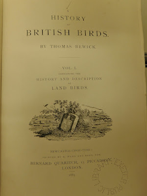 Quaritch’s publishing ventures also included a 5 volume ‘Memorial’ edition of the works of Thomas Bewick, which was issued in a limited run of 750 numbered copies in 1885. We have the whole set down in the cage area of the stack, and ours is numbered 44, with Bernard Quaritch’s signature appended in neat ink script. As we shall see, this is his restrained signature. He was capable of a flamboyent flourish of the pen when the mood took him. These books were printed in Newcastle, which is entirely appropriate since this is the city where Thomas Bewick lived for the greater part of his life. Bewick came from an ordinary background, the son of a tenant farmer and collier, and was apprenticed to an engraver named Ralph Beilby in Newcastle. It was an apprenticeship which developed into a business partnership as Bewick became skilled in the trade. The business was in metal engraving, but Bewick became interested in the art of wood engraving, which had become a neglected form at this time. A keen amateur naturalist, he began creating blocks for prints of animals with the idea of printing an illustrated book, working in the evenings after the official business of the day had been done. His General History of Quadrupeds was first published in 1790, and established his reputation on a national level. Two volumes of books on birds followed, the guide to Land Birds published in 1797 and Water Birds in 1804.
